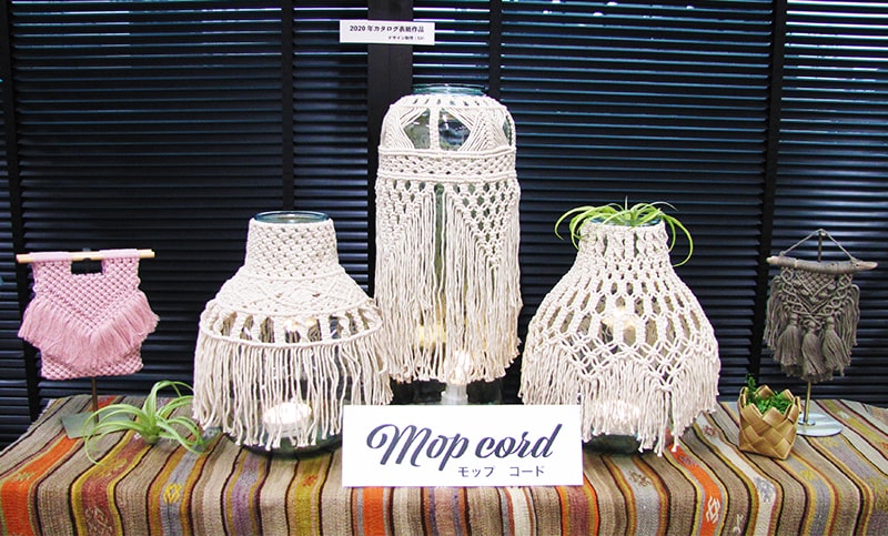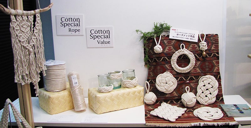 ピュアコットン100%素材のコットンスペシャルより、ロープノット作品に最適な太さ10mmのロープタイプが新登場!ダイナミックな作品が注目を浴びていました。