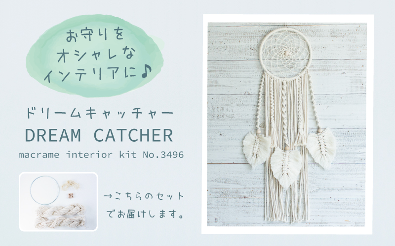 ドリームキャッチャーは悪夢から守ってくれる伝統的なお守りです。悪い夢は編み目へ引っ掛かり、 よい夢を運んでくれる羽根をマクラメで表現しました。