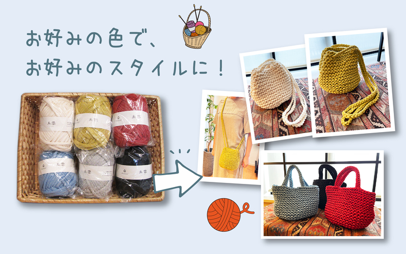 棒針で編むバッグ本体は共通で、持ち手またはショルダーを選んで取付けます。